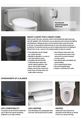 Details: Treat yourself to the soothing comfort and ambiance of the pure warmth heated toilet seat with LED night-light. With pure warmth, you can adjust the seat's heat level and lighting color/brightness just the way you like. Settings are easy to control using the button panel at the base of the seat, or download the pure warmth app for even more options through your smartphone. Pure warmth even lets you set your desired seat warmth and lighting for different times of day -- for example, warmer in the morning, brighter at night. Grip-tight bumpers add stability and prevent shifting. Requires a dedicated GFCI outlet. Fits most elongated Toilets.